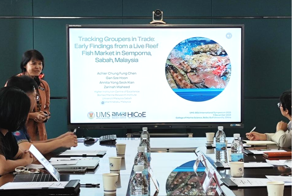 交流会上,扎丽娜博士以《追踪石斑鱼贸易:沙巴先本那活礁鱼市场的初步调查发现》为题,立足其长期深耕的珊瑚礁生态学研究,聚焦沙巴高价值石斑鱼贸易领域,通过对仙本那活礁鱼市场的实地调查,为石斑鱼资源的保护与贸易管控提供了基础数据支撑;