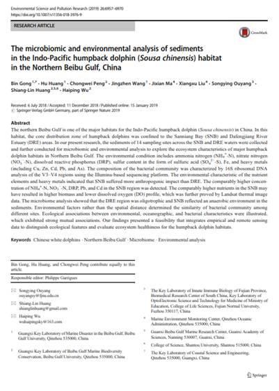 我实验室海洋微生物团队龚斌教授关于北部湾白海豚栖息地的研究论文“The microbiomic and environmental analysis of sediments in the Indo-Pacific Humpback Dolphin (Sousa chinensis) Habitat in the Northern Beibu Gulf, China”在环境科学经典SCI刊物Environmental Science and Pollution Research(IF=2.8)上发表。