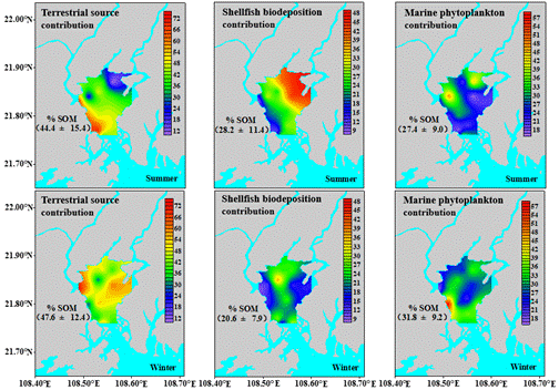 图1 基于三端元混合模型茅尾海夏、冬季表层沉积物陆源、贝类生物沉积、海洋浮游植物SOM相对贡献率空间分布