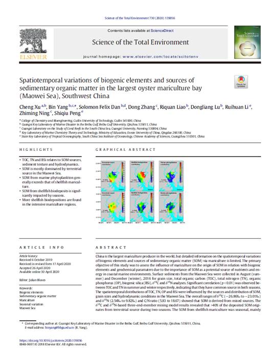 近期,广西北部湾海洋灾害研究重点实验室杨斌副教授团队徐程硕士研究生关于茅尾海沉积物生源要素时空变化及有机质来源的研究论文“Spatiotemporal variations of biogenic elements and sources of sedimentary organic matter in the largest oyster mariculture bay (Maowei Sea), Southwest China”在国际知名期刊Science of the Total Environment(SCI一区TOP,IF:5.589)在线发表。