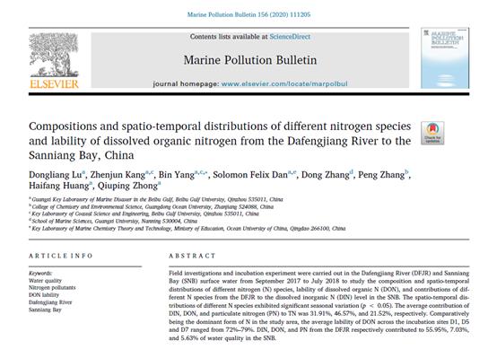 近期,广西北部湾海洋灾害研究重点实验室鲁栋梁副教授及团队成员,关于大风江不同形态氮对三娘湾海域的水质贡献研究,所获得的成果论文题目为《Compositions and spatio-temporal distributions of different nitrogen species and lability of dissolved organic nitrogen from the Dafengjiang River to the Sanniang Bay, China》发表在国际知名期刊《Marine Pollution Bulletin》(IF=3.782)。
