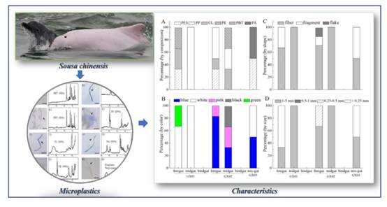 In the Anthropocene, marine microplastic debris has been rapidly increasing and interacting with wildlife. As apex predators, cetaceans have been proven to be ideal sentinel species to indicate ecosystem changes and umbrella and flagship species to help develop environmental management strategies. Here, we report the presence of microplastics in the intestines of Sousa chinensis for the first time, which highlights the potential impacts of microplastic pollution in coastal environments. Microplastics were detected in the intestinal contents of both adult and calf individuals, indicating that consumption of prey and unintentional ingestion are the potential pathways for microplastic accumulation in Sousa chinensis. The properties of the microplastics indicated that fibers, white and blue items, 1–5 mm items, and polyester were the predominant shapes, colors, sizes and plastic materials, respectively. More microplastics were detected in the foreguts and midguts than in the hindguts, which may be correlated with the specific intestinal structure of Sousa. This study indicates that coastal delphinids might suffer from microplastic pollution, even young calves. The sample size in this study is limited, whereas it's a starting point for assessing microplastics in the endangered coastal delphinid, Sousa. We suggest that assessments of the risks of microplastic consumption by cetaceans and the presence of microplastics in their habitats should be conducted at a global scale. Moreover, further works should be done to look for evidence of adverse effects of microplastics pollution on cetaceans.