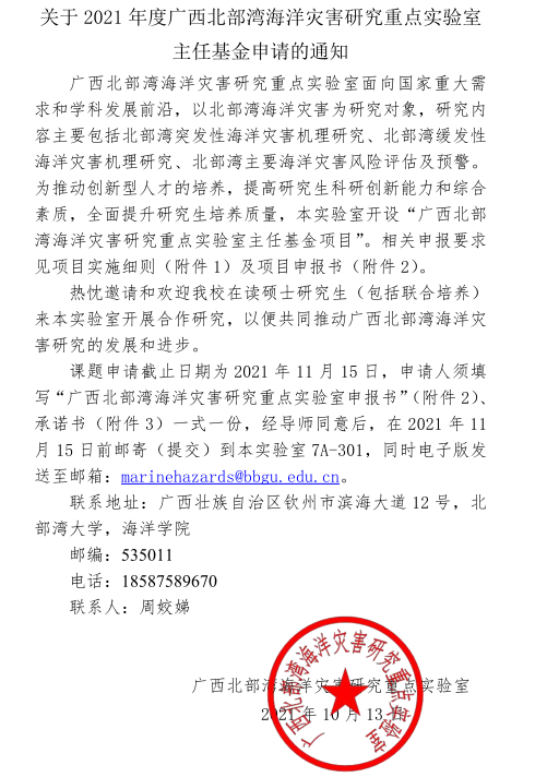 2021年度广西北部湾海洋灾害研究重点实验室主任基金申请的通知