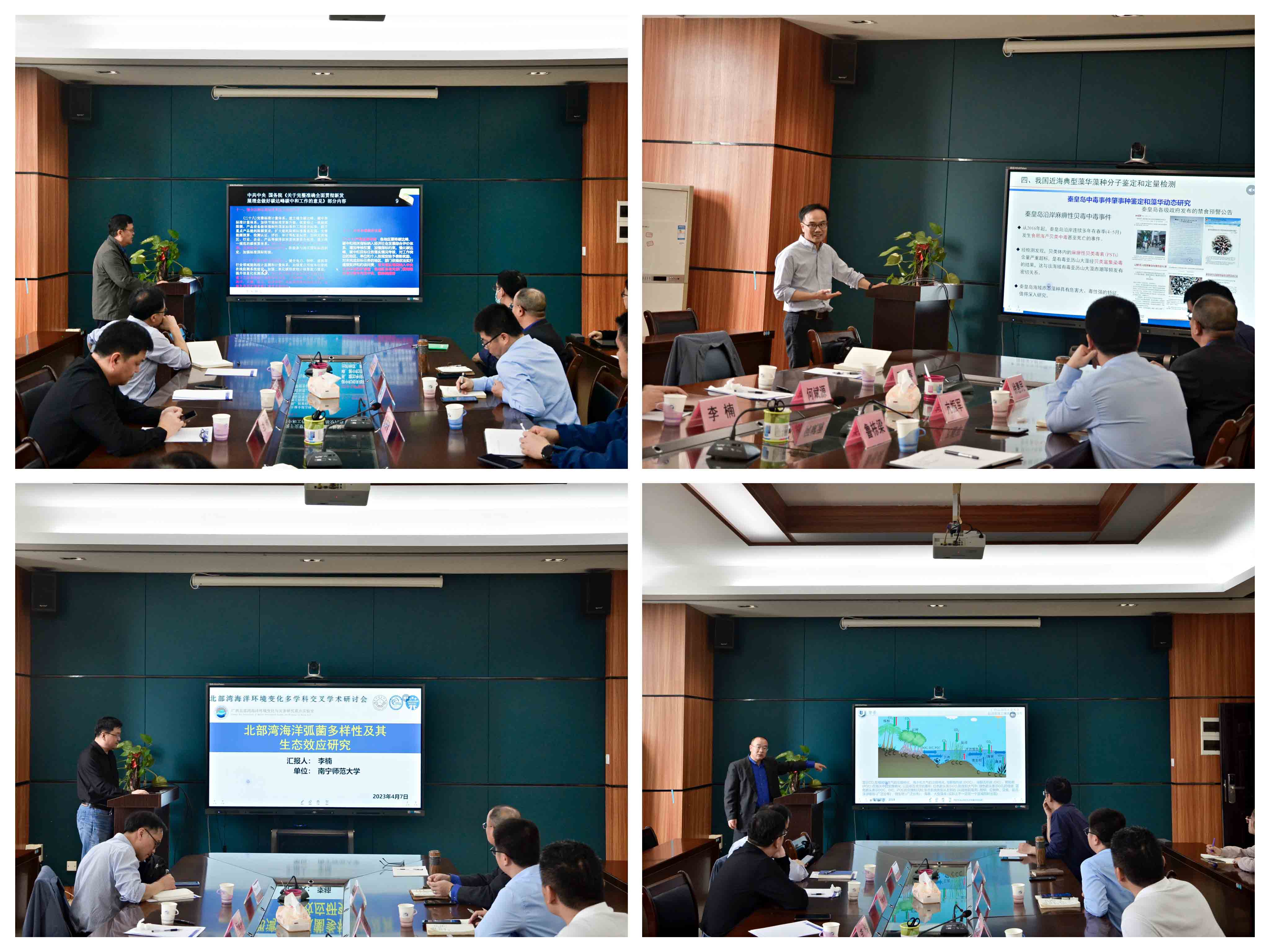 广西壮族自治区海洋研究院何斌源研究员(左上)、中国科学院海洋研究所张清春研究员(左下)、南宁师范大学李楠教授(右上)、北部湾大学徐慧民副教授(右下)分别作报告