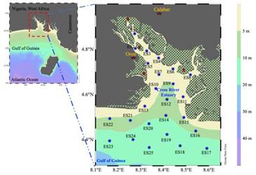 Fig. 1. Map of the study area showing the surface sediment sampling locations (blue dots) in the Cross River Estuary and nearshore area. The green patches represent some of the adjoining mangrove vegetation, while the red boxes are the mangrove sediments collection sites.