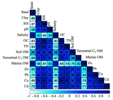 Fig. 4. Pearson correlation results (p < 0.05) of the studied parameters in surface sediments during the month (August) with the highest rain in 2017. Significant correlation increases with colour depth. The cross-marked param-eters are those with insignificant relationships.