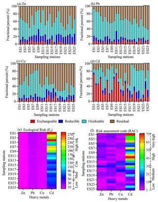 Fig. 3. Chemical partitioning of (a) zinc (Zn), (b) lead (Pb), (c) copper (Cu), (d) cadmium (Cd), and (e) ecological risk (Er) and (f) risk assessment code (RAC) of heavy metals in surface sediments during the month (August) with the highest rain in 2017. The abbreviations Med and Con in 8c represent medium risk and considerable risk, respectively.