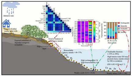 污染因子(CF)和地累积指数(Igeo)表明,CdZn是污染最严重的重金属。在非残留组分中较高比例的Zn(63.78%)Pb(64.48%)Cd(76.72%)和相当数量的Cu(48.57%)表明,这些重金属具有生物有效性。基于生态风险(Er)和风险评估代码(RAC)表明,Cd具有中高生态风险和生物利用性风险。重金属与细粒径沉积物呈显著正相关,沉积的OM来自于陆生的C3来源。重金属在可氧化组分中所占比例较高(~33-50%),表明邻近退化红树林生态系统的有机质和富含重金属细粒沉积物的侵蚀冲蚀对该研究区域表层沉积物中重金属含量增加贡献显著。