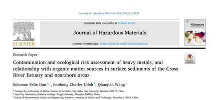 近日,我实验室Solomon Felix Dan博士在国际知名期刊《Journal of Hazardous Materials》(TOP,影响因子IF=14.224)上发表了题为“Contamination and ecological risk assessment of heavy metals, and relationship with organic matter sources in surface sediments of the Cross River Estuary and nearshore areas”的研究论文。
