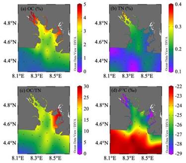 Fig. 2. Spatial distributions of (a) organic carbon (OC), (b) total nitrogen (TN), (c) molar ratio of organic carbon to total nitrogen (OC/TN), and (d) stable isotopic values of organic carbon (δ13C) in surface sediments during the month (August) with the highest rain in 2017.
