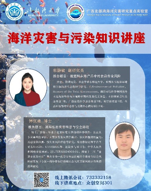 5月28日9:00—12:00实验室在众创空间301会议室,为公众开展了有关海洋灾害与污染科普知识讲座。本次讲座由鲁栋梁博士/副教授主持。会上,实验室的朱静敏博士/副研究员作了题为《微塑料在海产品中的食品安全风险》报告,生动地阐述了微塑料来源及危害。塑料是一把“双刃剑”,它给人们带来生活便利的同时,也对生物造成严重的灾难。通过微塑料存在形式及国内外微塑料污染研究现状介绍,让同学们人数到减少塑料垃圾,遏制微塑料的扩散,是人类不可推卸的共同责任。全面配合,缓解微塑料污染的蔓延,共同守护我们的碧海蓝天。随后谭沉艳博士作了题为《滨海旅游灾害科普与安全防范》报告,介绍了滨海旅游灾害的主要类型,安全防范措施及现代灾害预报技术,深入浅出的讲解和风趣幽默的语言赢得同学们的喜爱。互动环节,同学们踊跃提问。“一问一答”之中海洋灾害防范知识的种子在同学们心中播撒,加强了同学们对安全防护与灾害预警技术的认识。