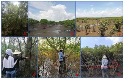 Figure 3. S. apetala community (a), K. candel community (b), A. corniculata community (c), DBH measurement (d),GPS measurement longitude and latitude (e), measured quadrat range (f).Among them, a, b and c were taken by Dr.Tian Yichao during the field mangrove survey, while d, e and f were taken by Yang Yongwei during the survey.