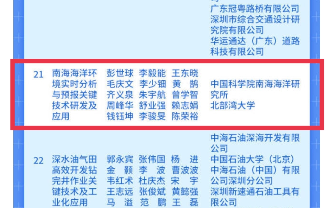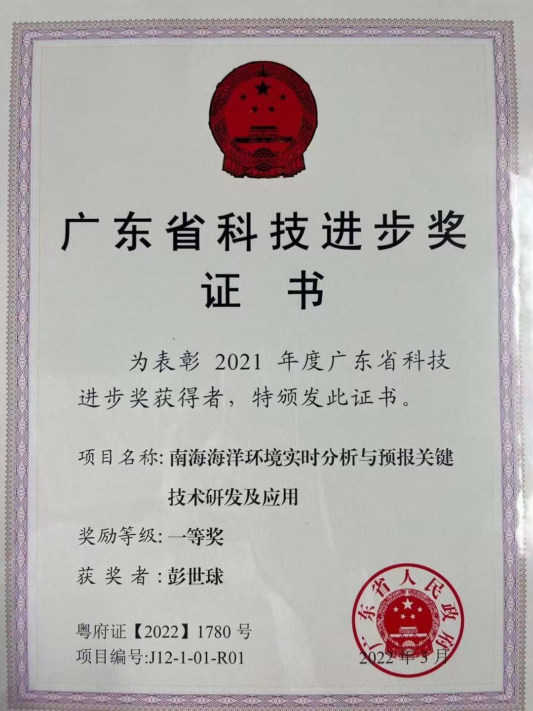 2022年4月15日,广东省科技创新大会在广州召开,会上颁发了2021年度广东省科学技术奖,180个项目(人)获奖,其中自然科学奖22项、技术发明奖12项、科技进步奖142项、科技合作奖4人。广东省科学技术奖是广东在科技成果奖励方面的最高荣誉,主要授予为促进科技进步和经济社会发展作出突出贡献的个人或组织。其中,中国科学院南海海洋研究所与北部湾大学共同完成的成果“南海海洋环境预报关键技术创新及应用”获广东省科技进步奖一等奖,第一完成人彭世球研究员作为获奖代表参会。