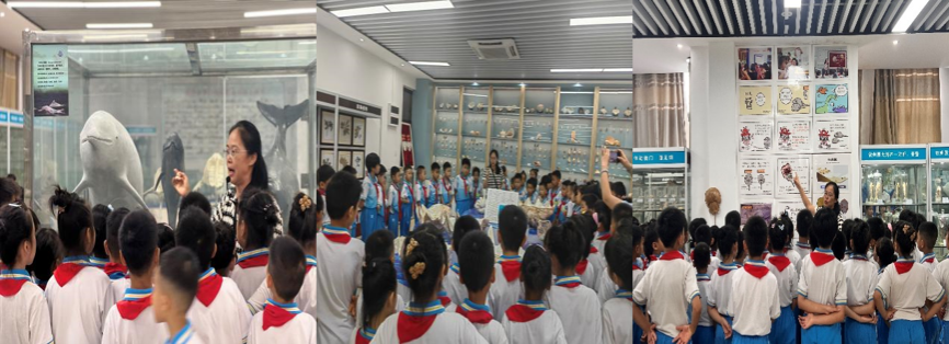 首先,贺鹏博士详细讲解了海洋风暴潮、赤潮等海洋灾害及相关安全意识。科普内容紧扣日常生活,从实例切入,生动有趣。这不仅使同学们认知了海洋灾害,更重要的是同学们学会了如何防御和应对海洋灾害。在讲座中,老师与学生进行交流互动,并共同回顾海洋灾害知识。作为大自然的一份子,我们有责任承担起保护海洋、减少灾害发生的重任,共建蓝色的美好家园。接下来,林美芳老师带领同学们参观标本馆,在耐心讲解砗磲、白海豚、鲎等海洋生物,同学们对北部湾的海洋生物有了更深入的认识。最后由鲁栋梁教授和林美芳老师分别指导同学们进行液氮实验与红树植物制作。鲁栋梁教授通过“气球和香蕉在不同温度下的变化”的实验揭示了气体和香蕉热胀冷缩背后的秘密,解读了日常生活中存在的科学现象之谜题。这激发了孩子们对科学奥秘探索的兴趣。林美芳老师向同学们展示了红树林是如何抵御风浪并起到防风护堤作用,还讲解了红树林名称的由来及特点等相关知识。期间同学们们表现得非常认真积极,在场的每个人都笑容满面像向日葵般灿烂,现场互动氛围十分浓厚。