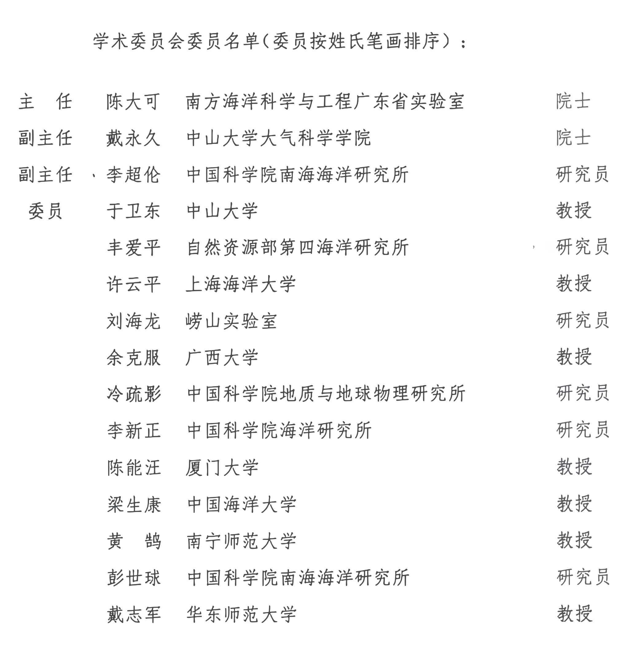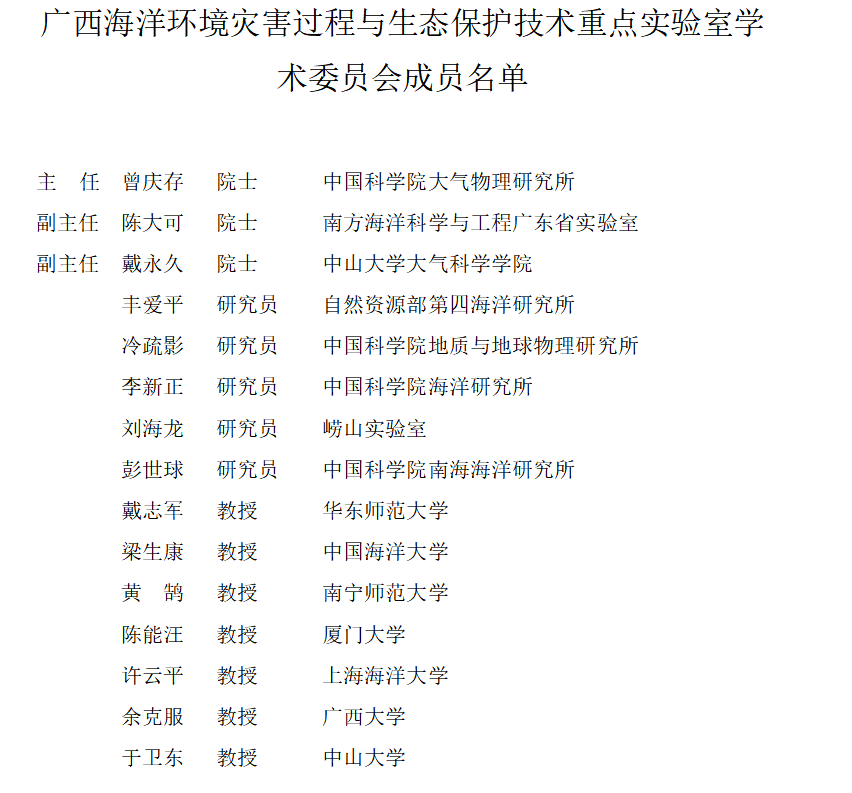 广西海洋环境灾害过程与生态保护技术重点实验室学术委员会