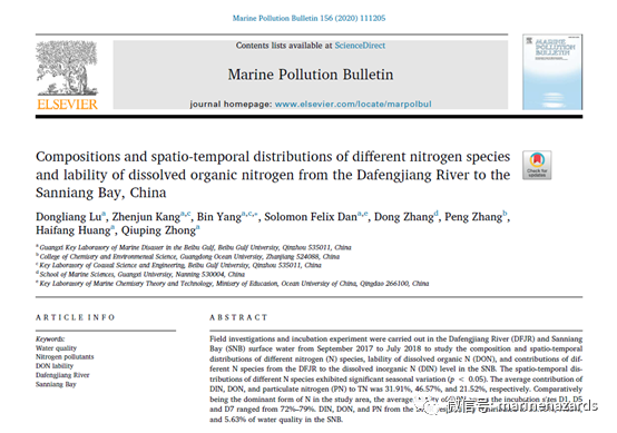 近期,广西北部湾海洋灾害研究重点实验室鲁栋梁副教授及团队成员,关于大风江不同形态氮对三娘湾海域的水质贡献研究,所获得的成果论文题目为《Compositions andspatio-temporal distributions of different nitrogen species and lability ofdissolved organic nitrogen from the Dafengjiang River to the Sanniang Bay,China》发表在国际知名期刊《Marine Pollution Bulletin》(IF=3.782)。