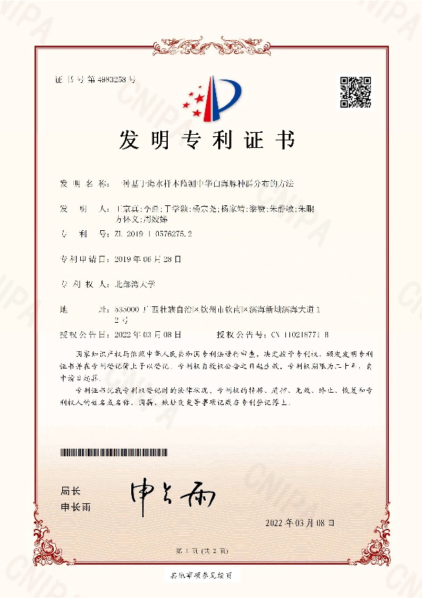 近日,我实验室王京真教授团队开发的“一种基于海水样本监测中华白海豚种群分布的方法”专利获国家知识产权局正式授权,专利号为ZL 2019 1 0576275.2,研发团队成员还包括李鼎、于学颖、杨宗尧、杨家靖、黎赞、朱静敏、朱鹏、方怀义、周姣娣九位成员。
